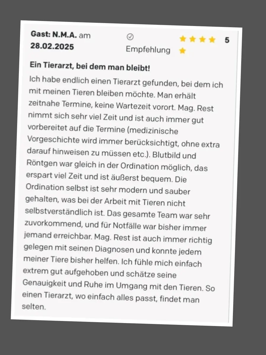 Zusammen bilden wir ein Team, das sich der Gesundheit und dem Wohlbefinden von Tieren verschrieben hat. Unsere Hingabe geht über die bloße Arbeit hinaus, denn wir teilen die Freude der Tierbesitzer, wenn deren geliebte Haustiere gesund werden, und trösten sie in schwierigen Momenten. Wir sehen uns als Unterstützung für Tierbesitzer und ihre pelzigen oder gefiederten Freunde.